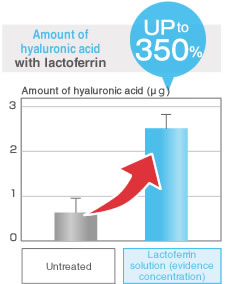 On top of those benefits already known, we found that lactoferrin is not only able to activate cells on the skin, but also verified its effect deep into it. We discovered that the amount of "collagen", "elastin" and "hyaluronic acid" increased up to even a 350%.